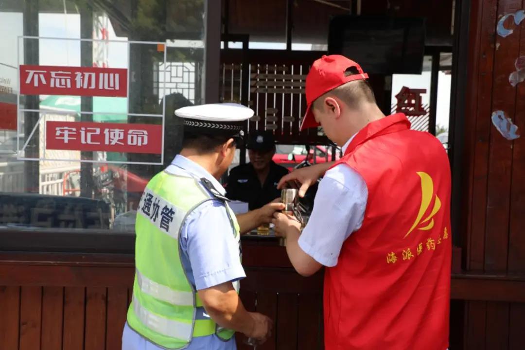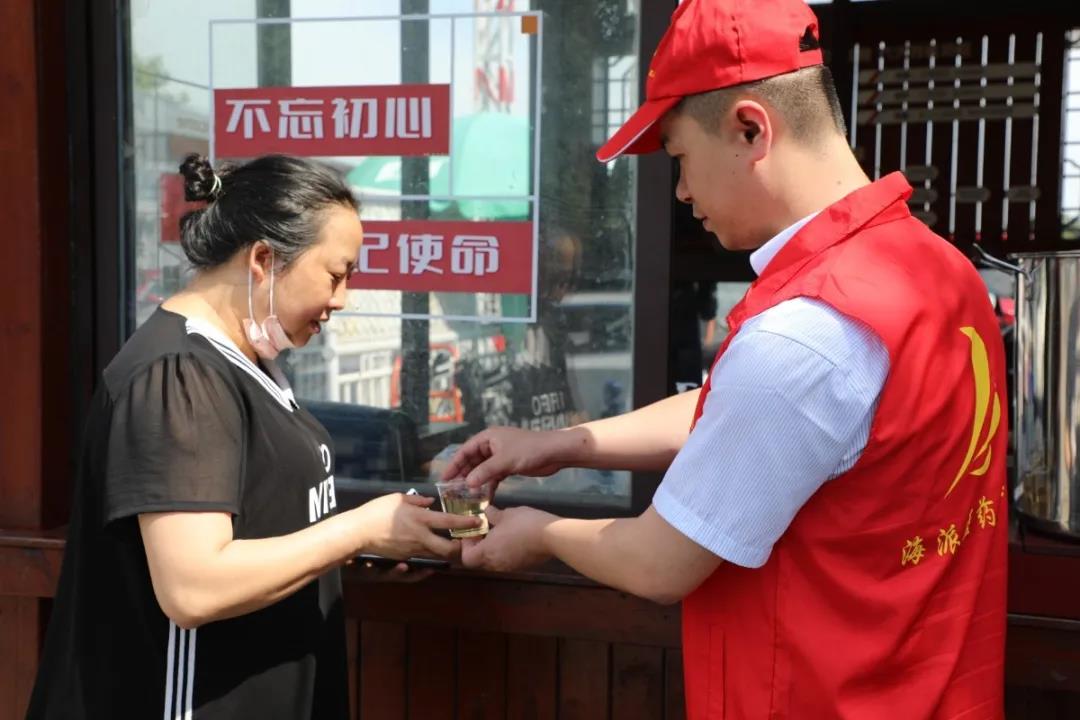 來自海派醫(yī)藥的黨員志愿者頂著炎熱的陽光,站在街頭為往來的家屬病患以及行人們親手遞上解暑茯茶,減輕夏日的燥熱,并為廣大群眾免費(fèi)提供口罩、風(fēng)油精、紙巾等物品?;鸺t的馬甲、熱情的服務(wù),儼然成為這個夏日最亮麗的一道“紅色風(fēng)景線”。